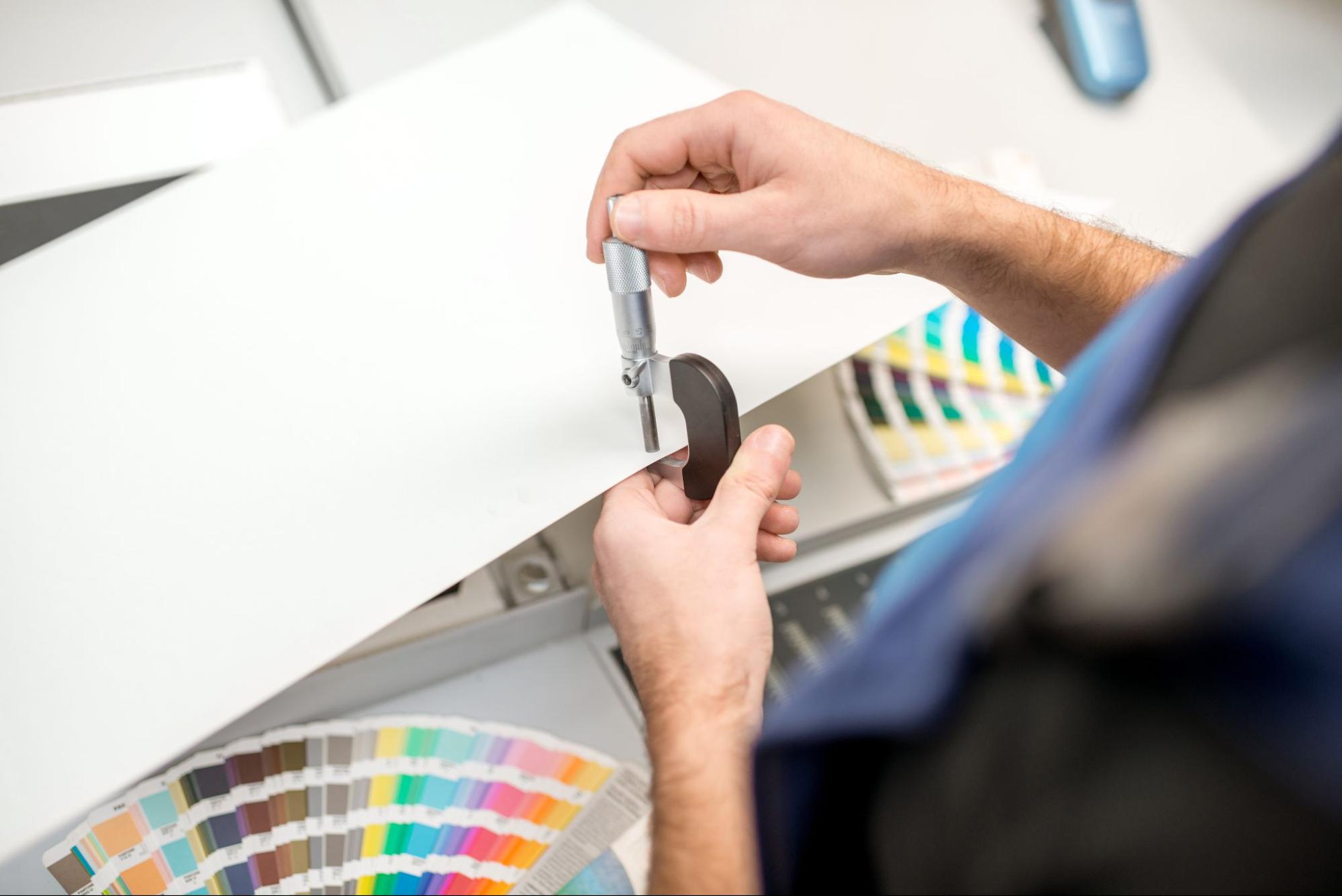 紙厚(しあつ)は、その名の通り紙そのものの厚さをミリメートル(mm)やマイクロメートル(μm)で直接表した数値のことです。